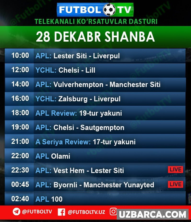 FUTBOL TV telekanalining 28-dekabr kunidagi ko'rsatuvlar dasturi