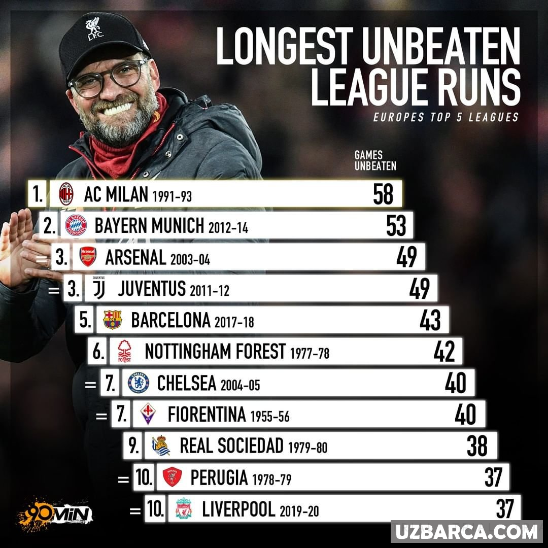 TOP-5 chempionatda eng ko'p mag'lubiyatsiz seriya qayd etgan jamoalar