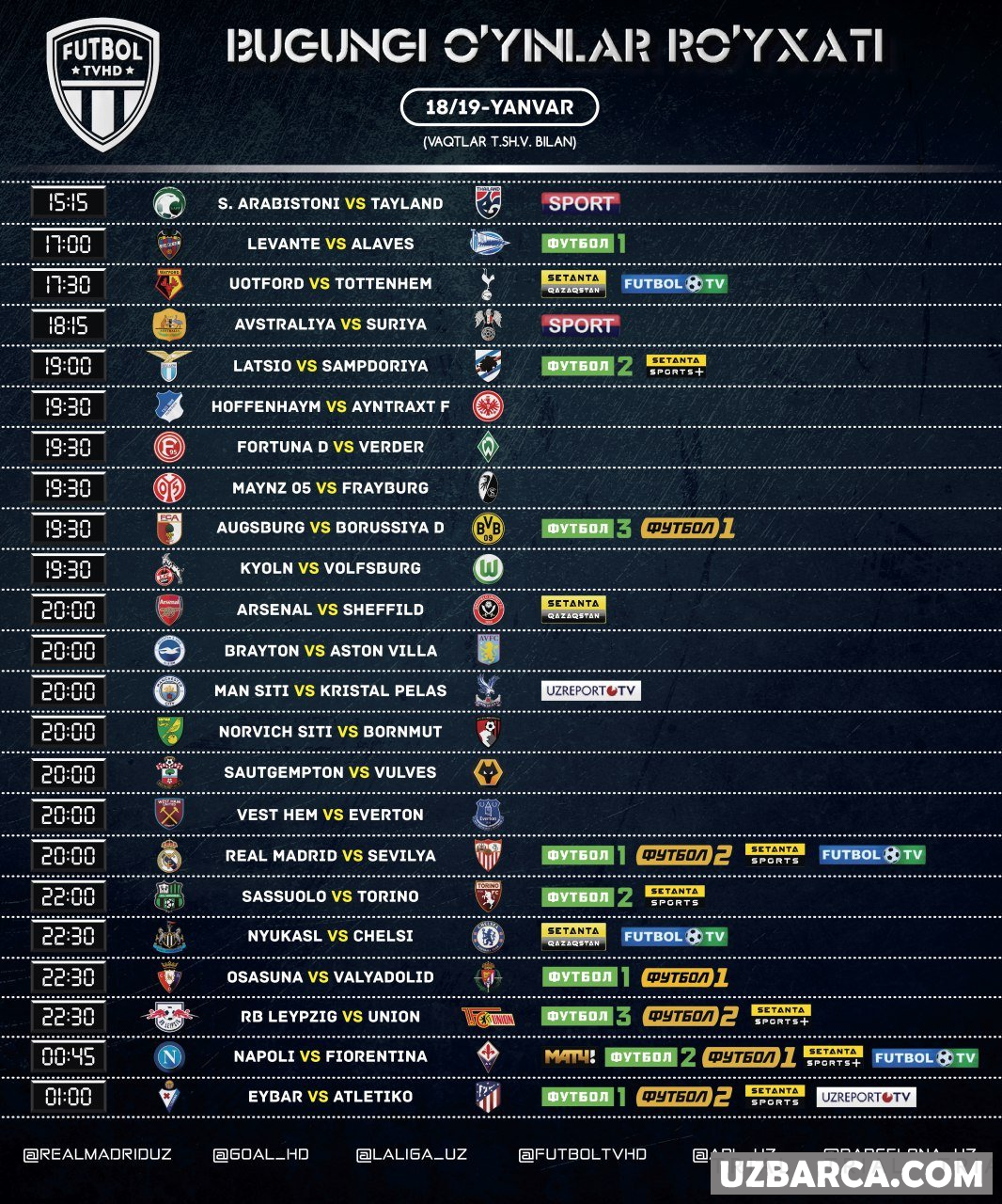 Bugungi uchrashuvlar ro'yxati va ularni translyatsiya qiladigan telekanallar! Barcha o'yinlar Tshv bilan ko'rsatilgan!