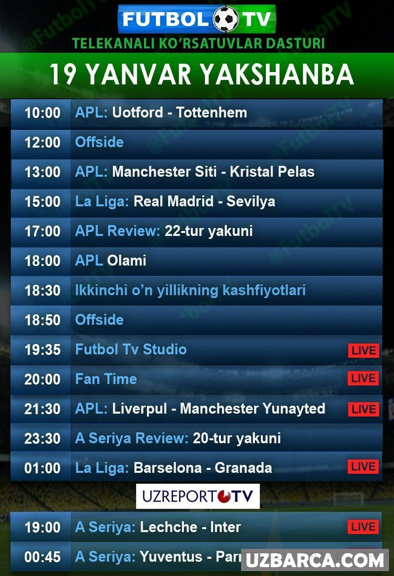 FUTBOL TV telekanalining 19-yanvar kunidagi ko'rsatuvlar dasturi