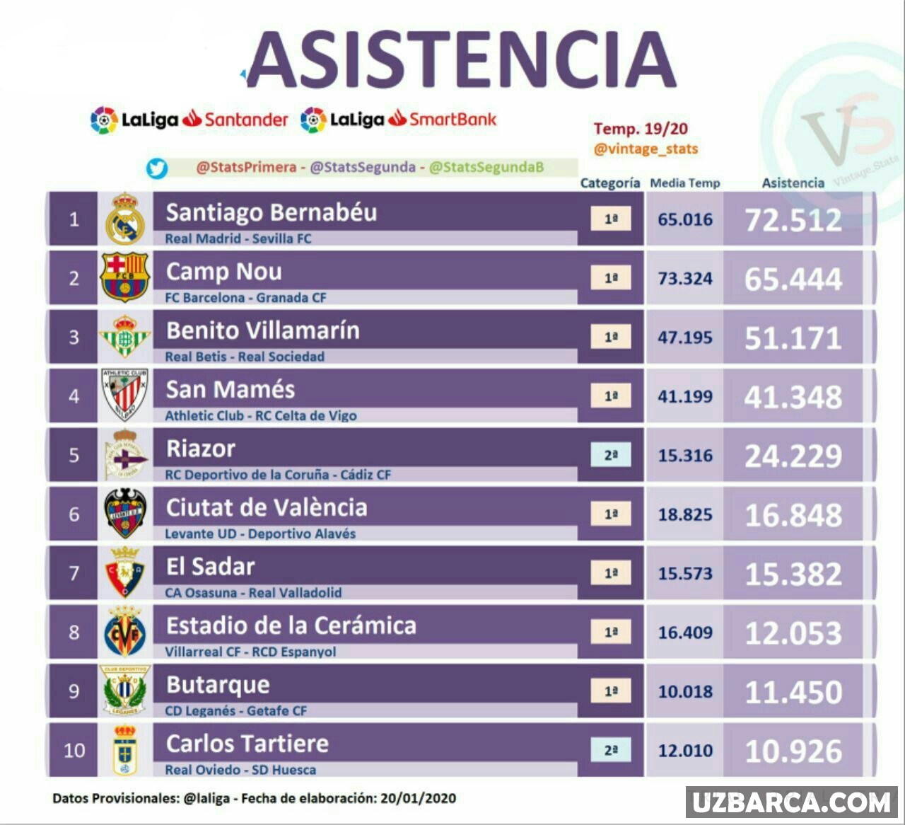 Bu hafta Ispaniya chempionati o'yinlariga eng ko'p tomoshabin tashrif buyurgan o'yinlar ro'yhati