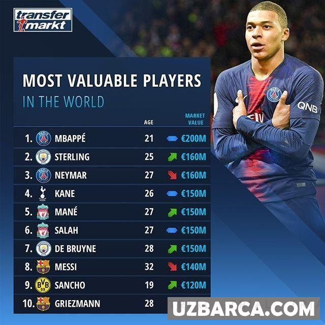 Transfermarkt:Ayni damdagi eng qimmat Top-10 futbolchilar