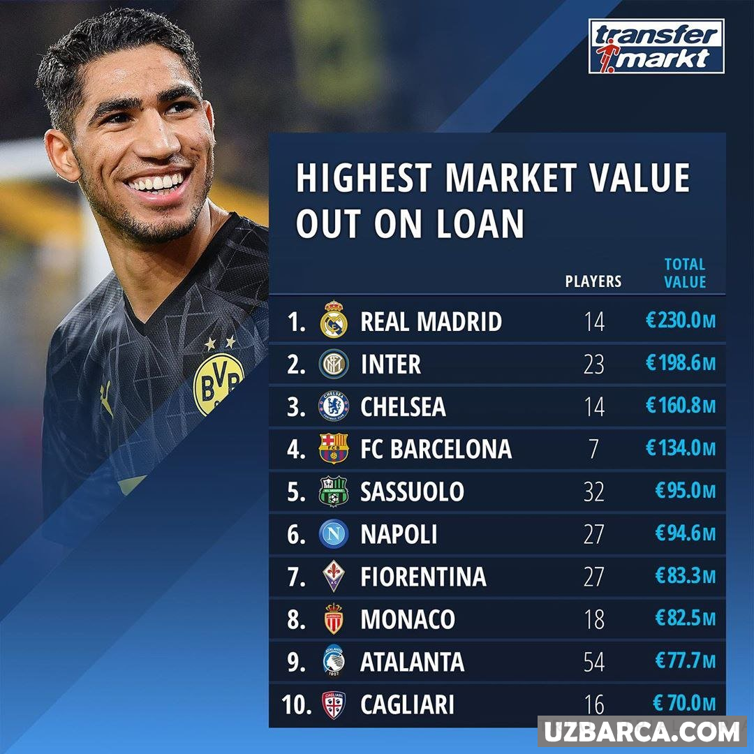 Jamoalar ijaraga bergan futbolchilarining umumiy transfer qiymati
