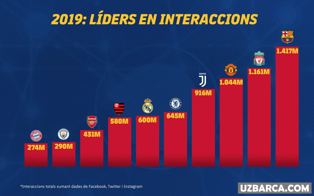 "Barselona" 2019 yilda ijtimoiy tarmoqlardagi o'zaro aloqalar soni bo'yicha futbol klublari orasida etakchi hisoblanadi.