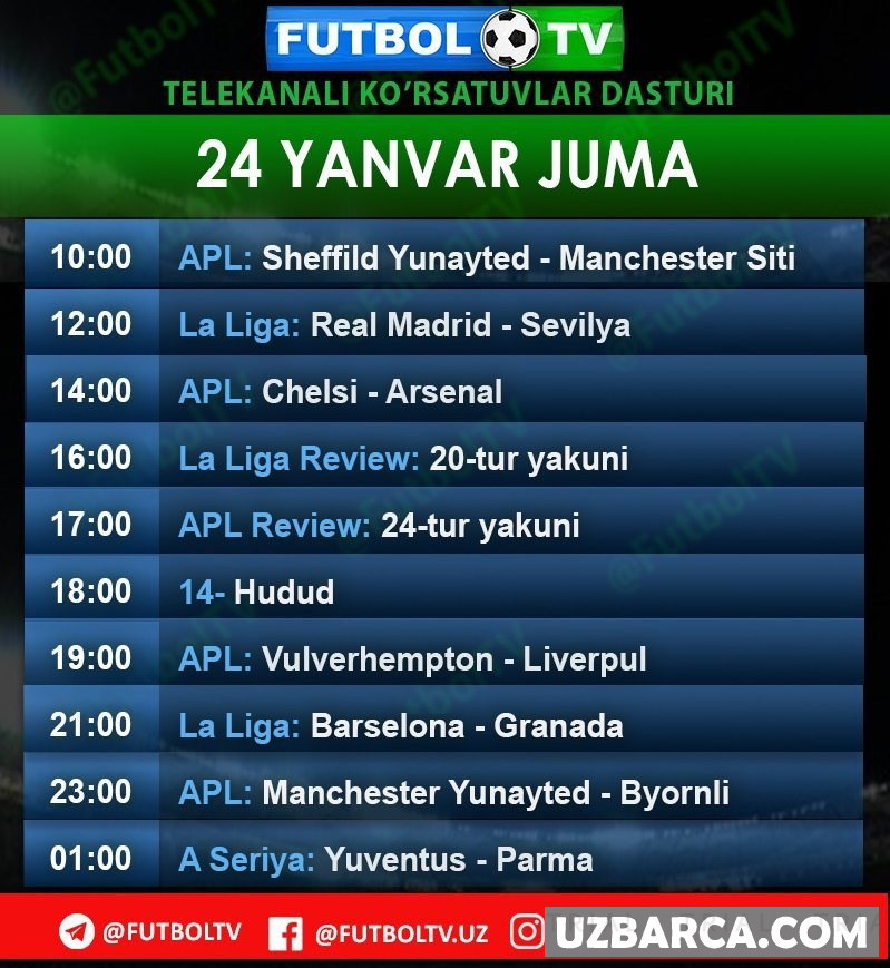 FUTBOL TV telekanalining 24-yanvar kunidagi ko'rsatuvlar dasturi