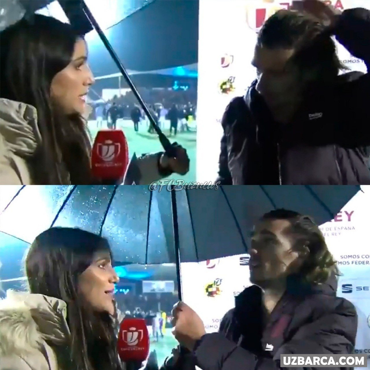 Griezmann muxbirning soyabonini oldi, uning ishlashini osonlashtirishi uchun.