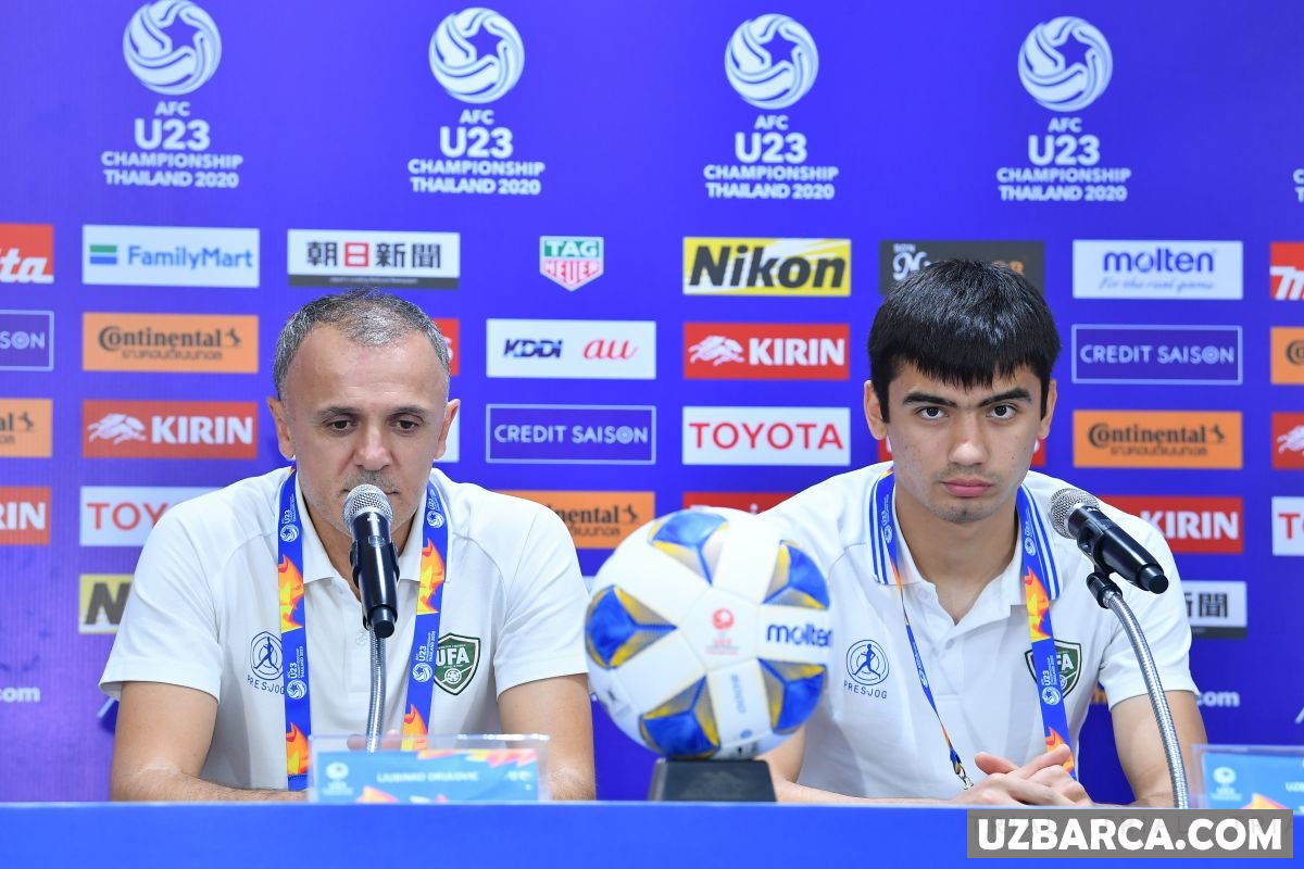 Ananaga muvofiq uchrashuvdan bir kun avval har ikki terma jamoa bosh murabbiylari ishtirokida matbuot-anjumani bo'lib o'tdi. Jamoalar yakuniy bosqichda bo'lgani bois murabbiylar bilan birga har ikki jamoaning bir nafardan futbolchilari ham mazkur anjumanda ishtirok etishdi. Terma jamoamizdan olimpiyachilarimiz sardori Islomjon Qobilov qatnashdi.