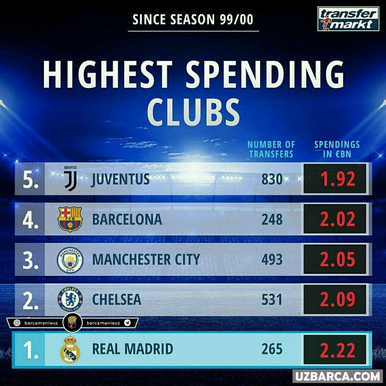 2000-yildan buyon hozirgacha transferlarga eng ko'p pul sarflagan klublar !