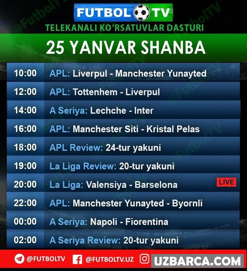 FUTBOL TV telekanalining 25-yanvar kunidagi ko'rsatuvlar dasturi
