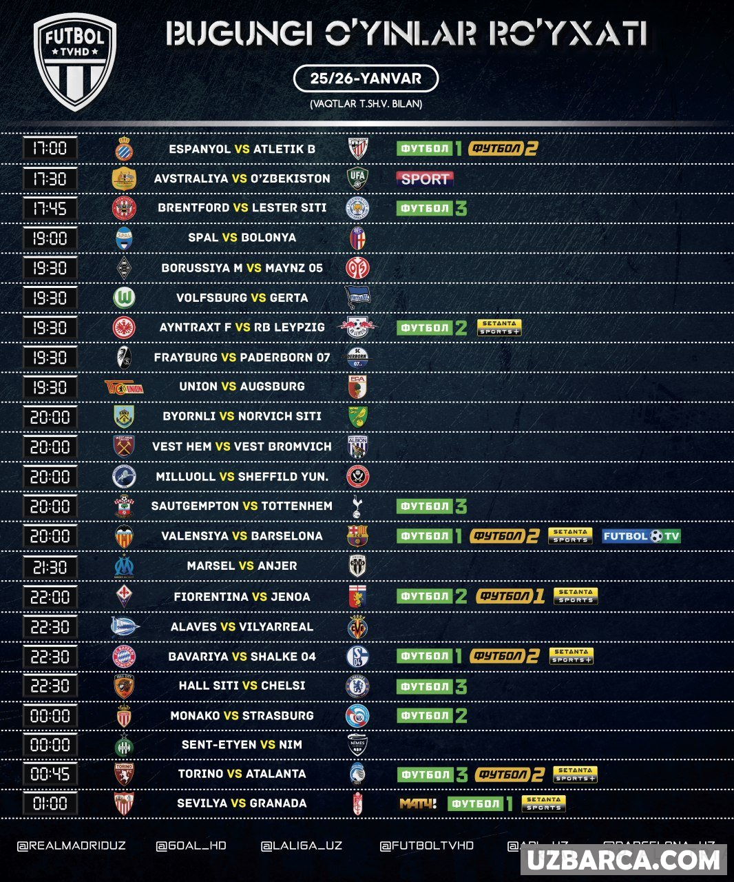 Bugungi uchrashuvlar ro'yxati va ularni translyatsiya qiladigan telekanallar! Barcha o'yinlar Tshv bilan ko'rsatilgan!