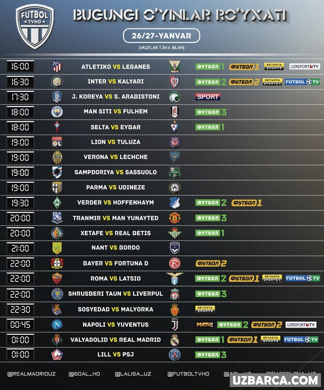 Bugungi uchrashuvlar ro'yxati va ularni translyatsiya qiladigan telekanallar! Barcha o'yinlar Tshv bilan ko'rsatilgan!