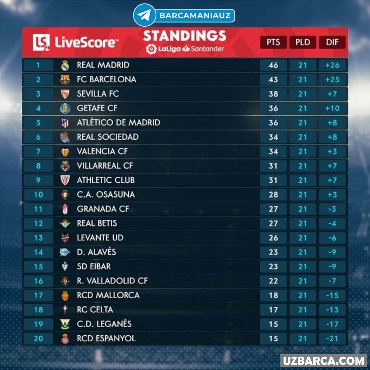 LaLiga. 21-turdan so'ng turnir jadvalidagi holat