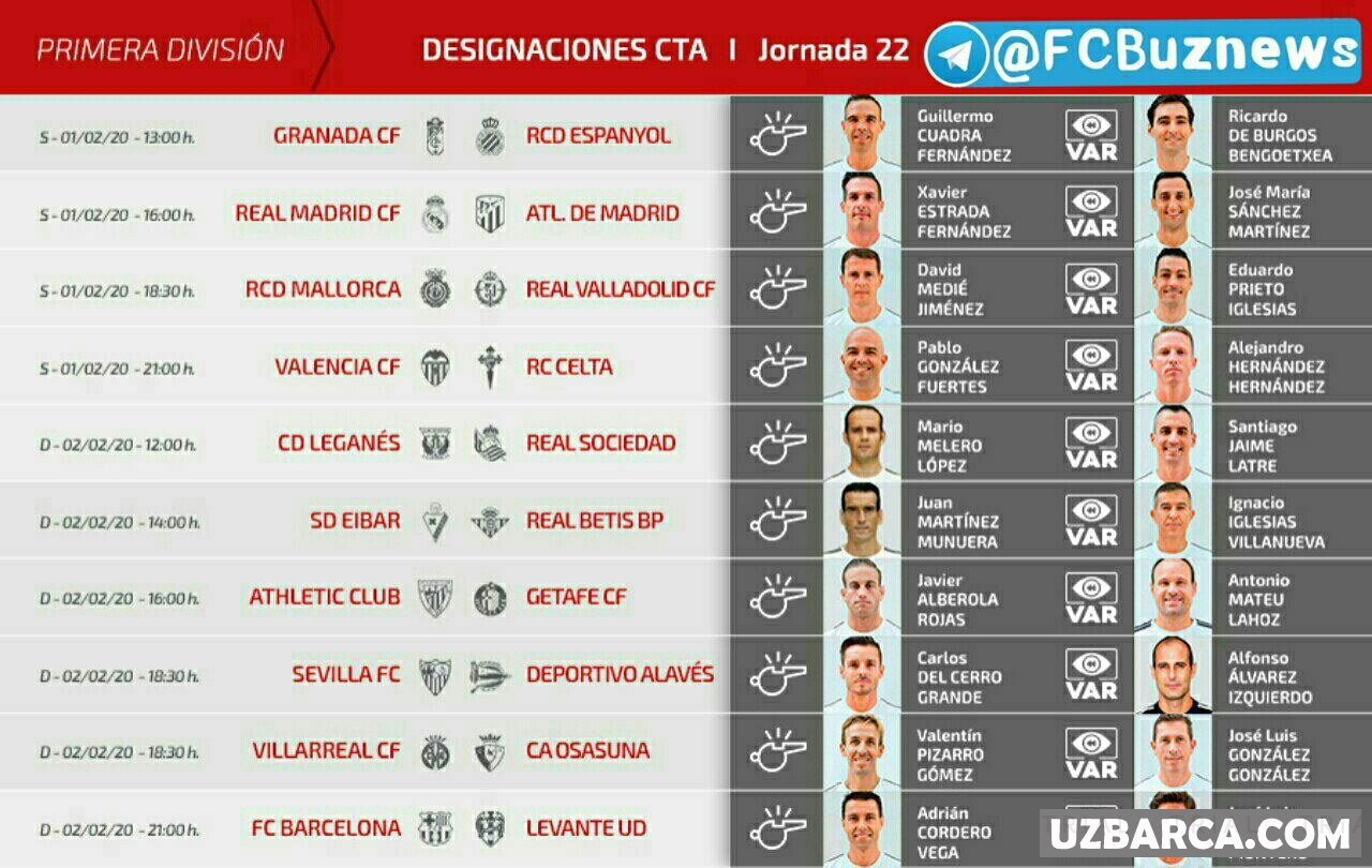 La Liga 22 tur o'yinlarini boshqarib boradigan va "VAR"da o'tiradigan hakamlar brigadasi