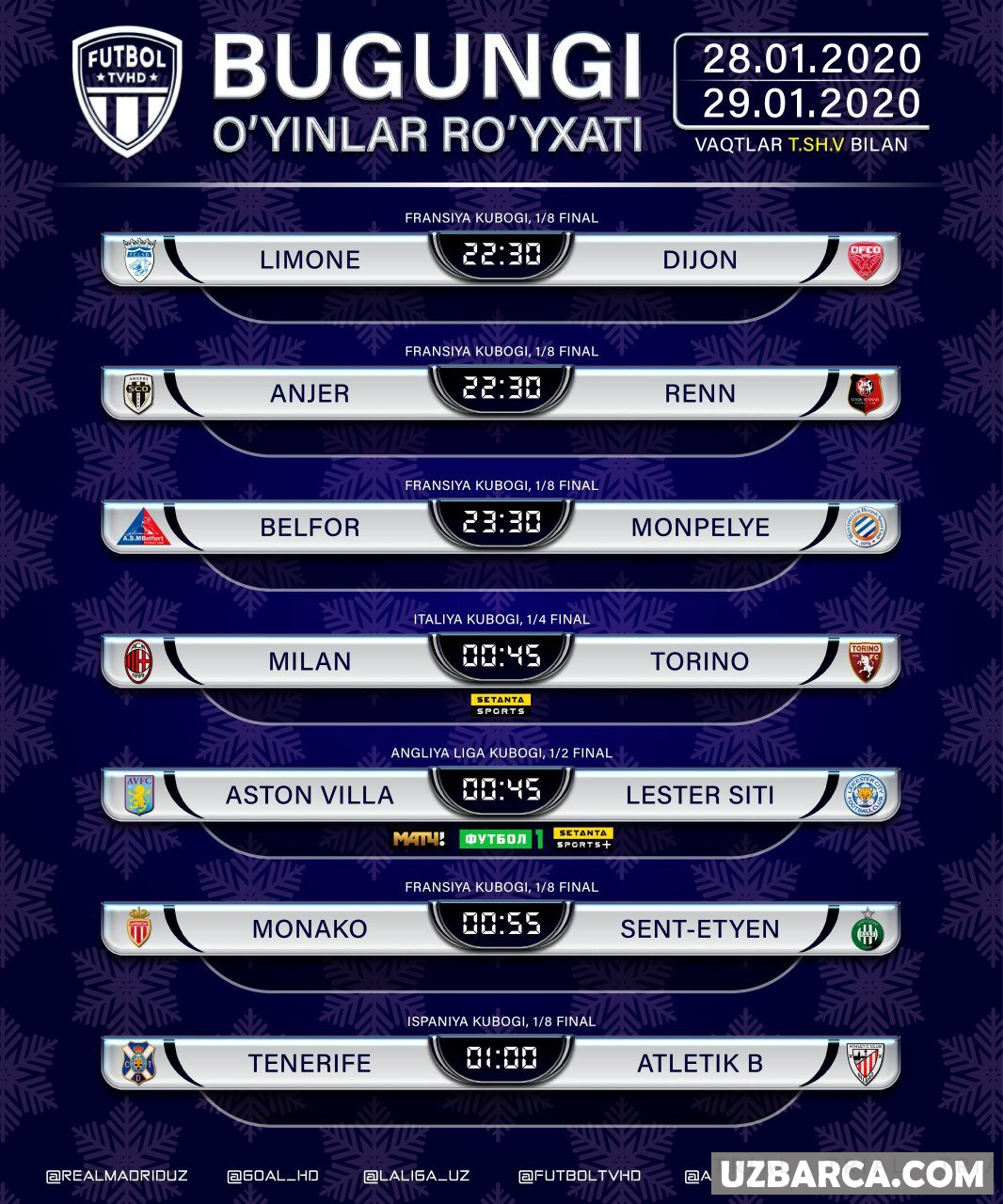 Bugungi uchrashuvlar ro'yxati va ularni translyatsiya qiladigan telekanallar! Barcha o'yinlar Tshv bilan ko'rsatilgan!