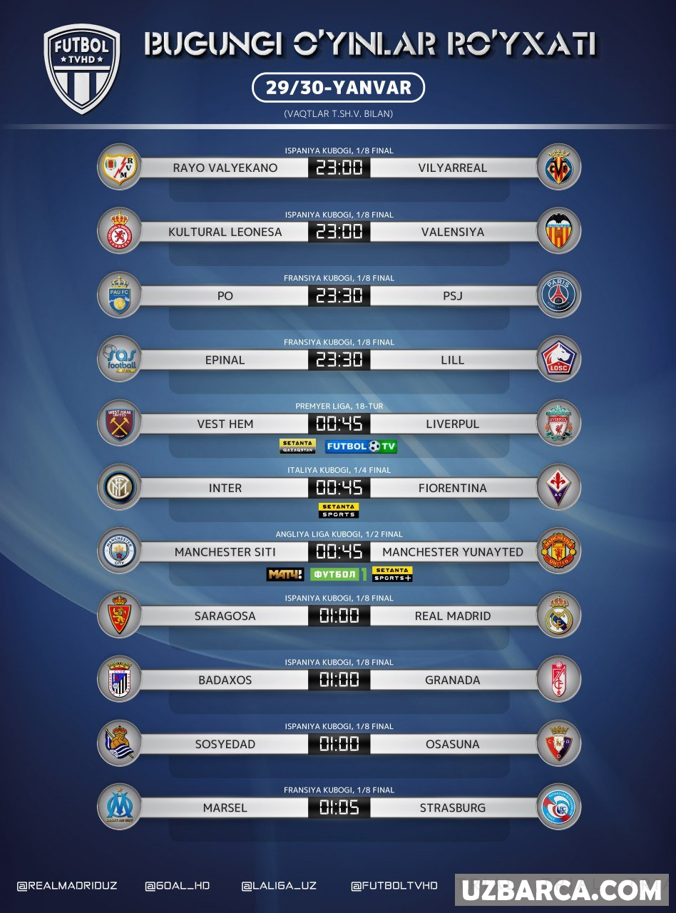 Bugungi uchrashuvlar ro'yxati va ularni translyatsiya qiladigan telekanallar! Barcha o'yinlar Tshv bilan ko'rsatilgan!