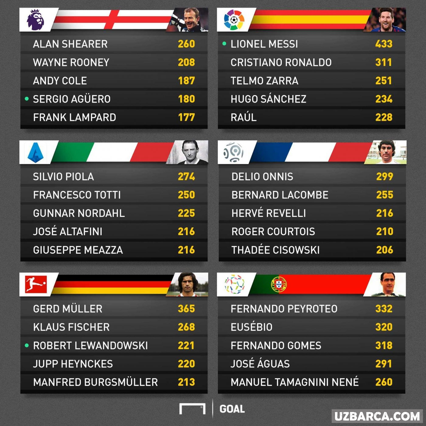 Top 6 ligalarning barcha davrlardagi eng yahshi to'purarlari