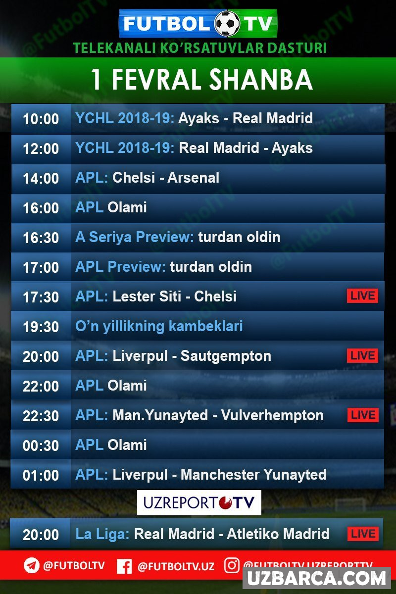 FUTBOL TV telekanalining 1-fevral kunidagi ko'rsatuvlar dasturi