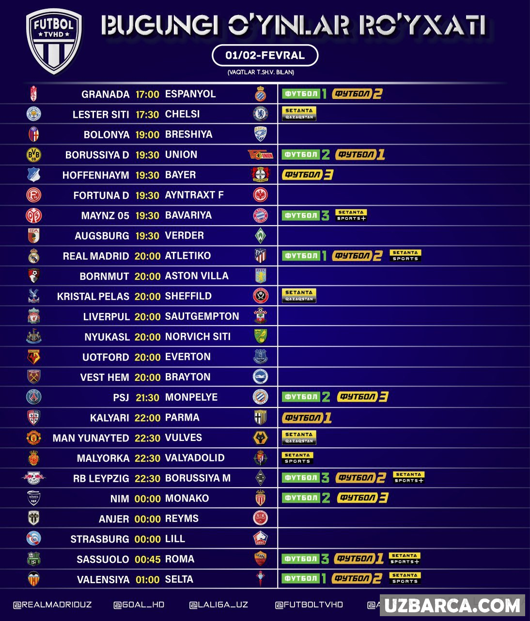 Bugungi uchrashuvlar ro'yxati va ularni translyatsiya qiladigan telekanallar! Barcha o'yinlar Tshv bilan ko'rsatilgan!