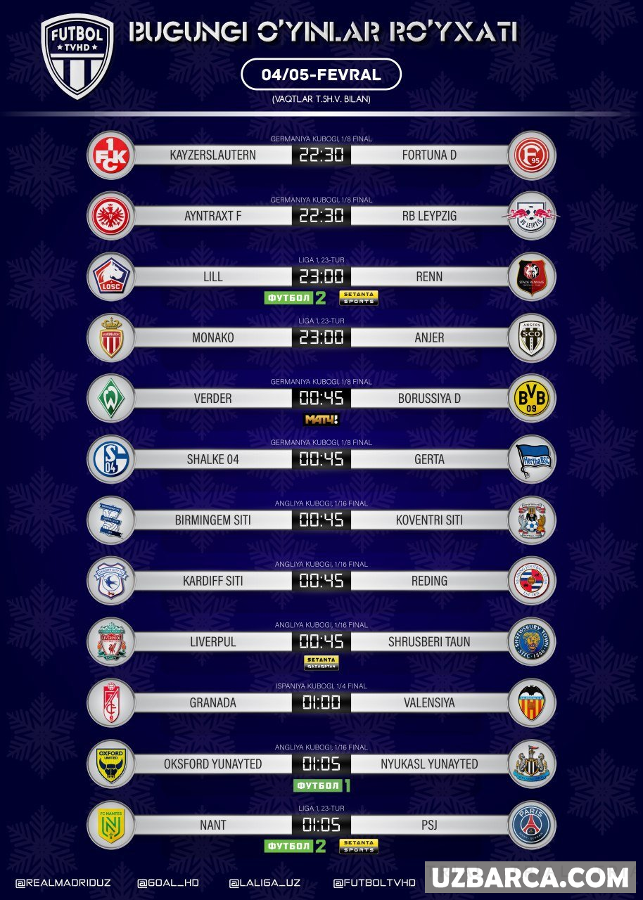 Bugungi uchrashuvlar ro'yxati va ularni translyatsiya qiladigan telekanallar! Barcha o'yinlar Tshv bilan ko'rsatilgan!