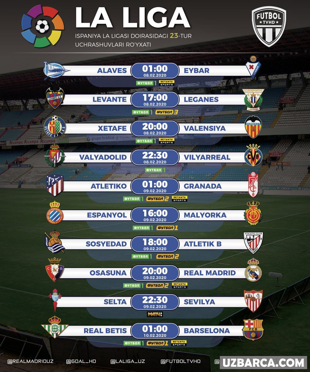 Ispaniya La Ligasining 23-tur uchrashuvlari ro'yxati bilan tanishing! Barcha o'yinlar (Tshv) bilan ko'rsatilgan!