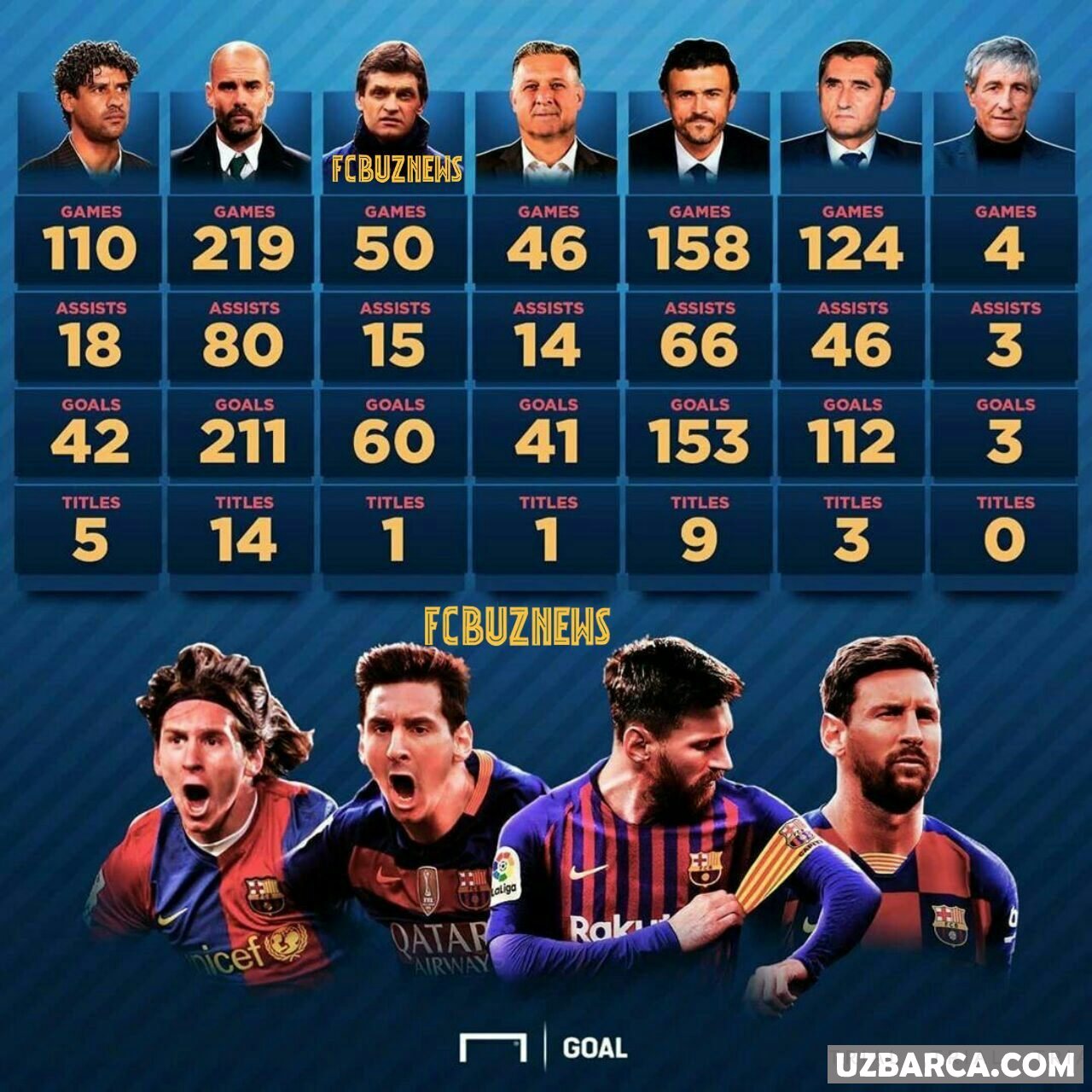 "Barcelona"da murabbiylik qilgan so'nggi 7⃣ ta murabbiy qo'l ostida, Leo Messi qayd etgan statistikalari