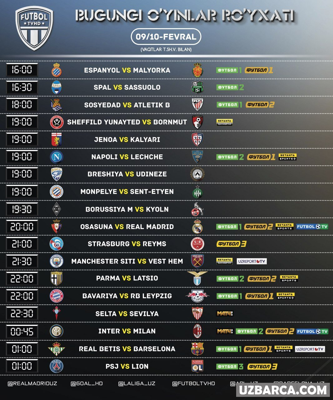 Bugungi uchrashuvlar ro'yxati va ularni translyatsiya qiladigan telekanallar! Barcha o'yinlar Tshv bilan ko'rsatilgan!