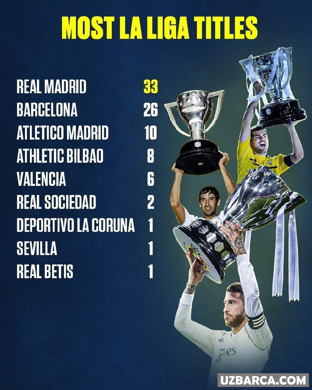 LaLiga tarixida eng ko'p sovrin qo'lga kiritgan klublar