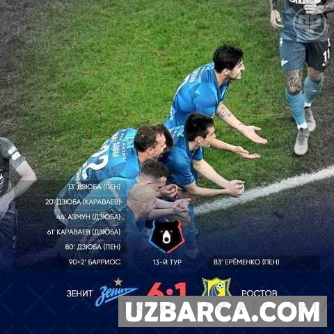 Rossiya Premer-ligasi, 13-tur. Zenit 6-1 Rostov Gollar: 1: 0 - 13, penalti Dziuba, 2: 0 - 20 'Dziuba, 3: 0 - 44' Azmun, 4: 0 - 61 'Karavaev, 5: 0 - 80, penalti Dziuba, 5: 1 - 83, penalti Eremenko, 6: 1 - 90 + 2 'Barrios.