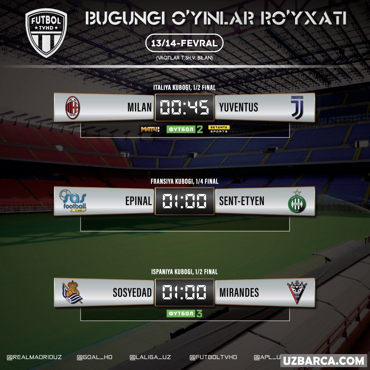 Bugungi uchrashuvlar ro'yxati va ularni translyatsiya qiladigan telekanallar! Barcha o'yinlar Tshv bilan ko'rsatilgan!