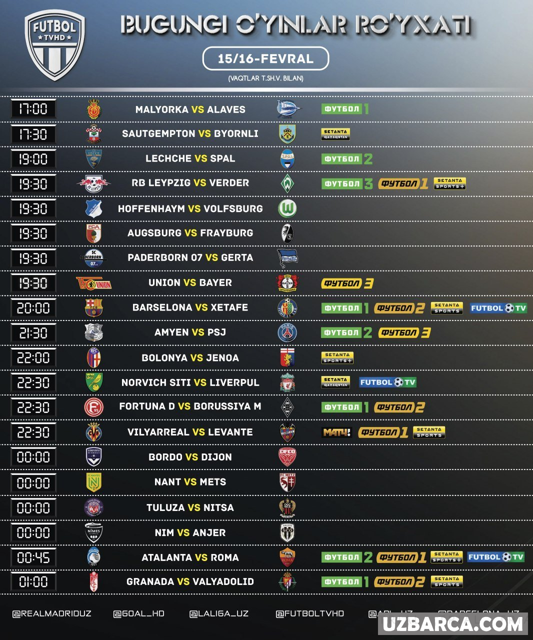 Bugungi uchrashuvlar ro'yxati va ularni translyatsiya qiladigan telekanallar! Barcha o'yinlar Tshv bilan ko'rsatilgan!