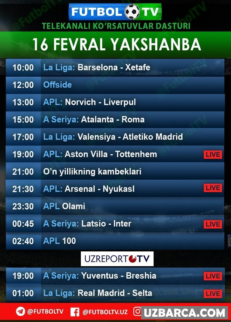 FUTBOL TV telekanalining 16-fevral kunidagi ko'rsatuvlar dasturi