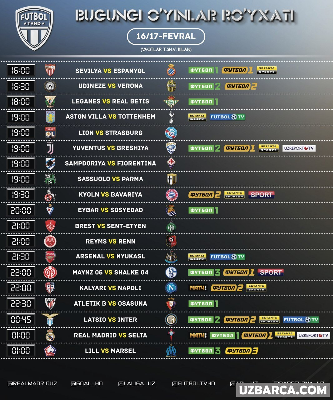 Bugungi uchrashuvlar ro'yxati va ularni translyatsiya qiladigan telekanallar! Barcha o'yinlar Tshv bilan ko'rsatilgan!