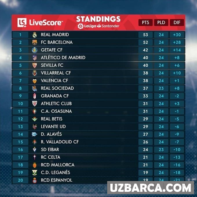 La Liga 24-turdan so'ng turnir jadvalidagi holat