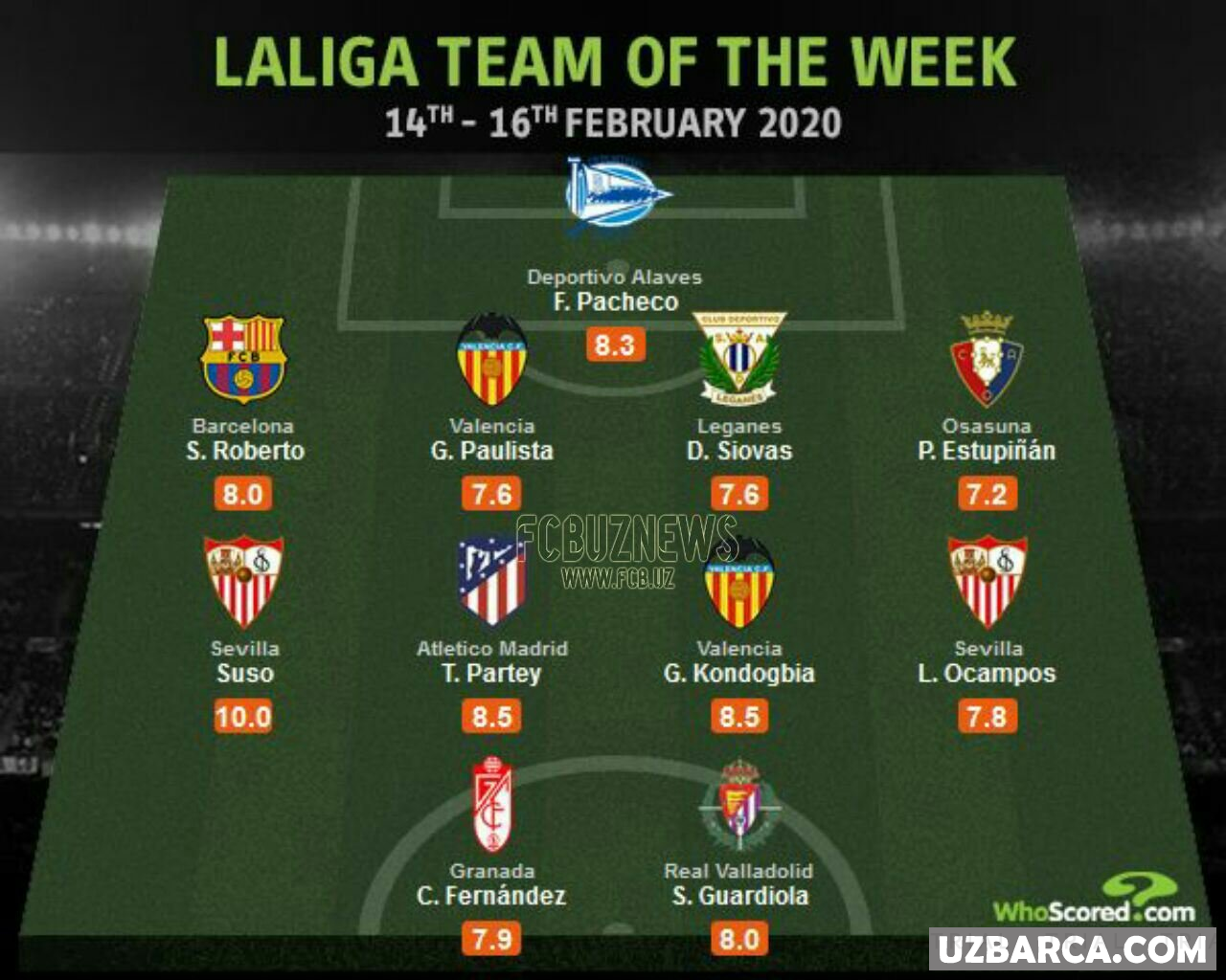 WhoScored talqiniga ko'ra, La Liga 24 tur o'yinlaridagi eng yaxshi futbolchilaridan tuzilgan ramziy jamoasi