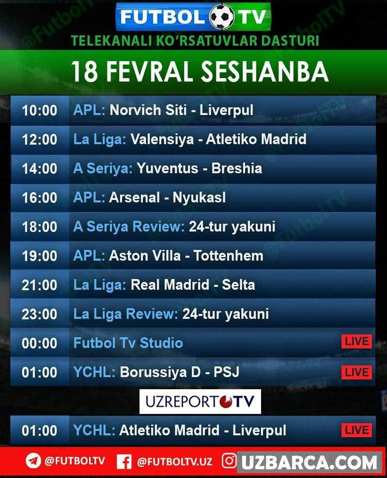 FUTBOL TV telekanalining 18-fevral kunidagi ko'rsatuvlar dasturi