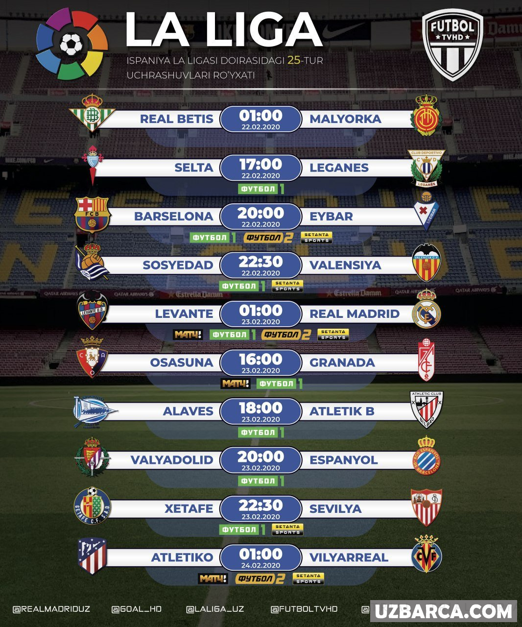 Ispaniya La Ligasining 25-tur uchrashuvlari ro'yxati bilan tanishing! Barcha o'yinlar (Tshv) bilan ko'rsatilgan!
