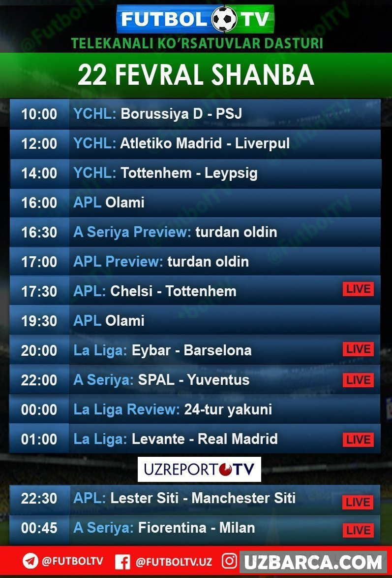 FUTBOL TV telekanalining 22-fevral kunidagi ko'rsatuvlar dasturi
