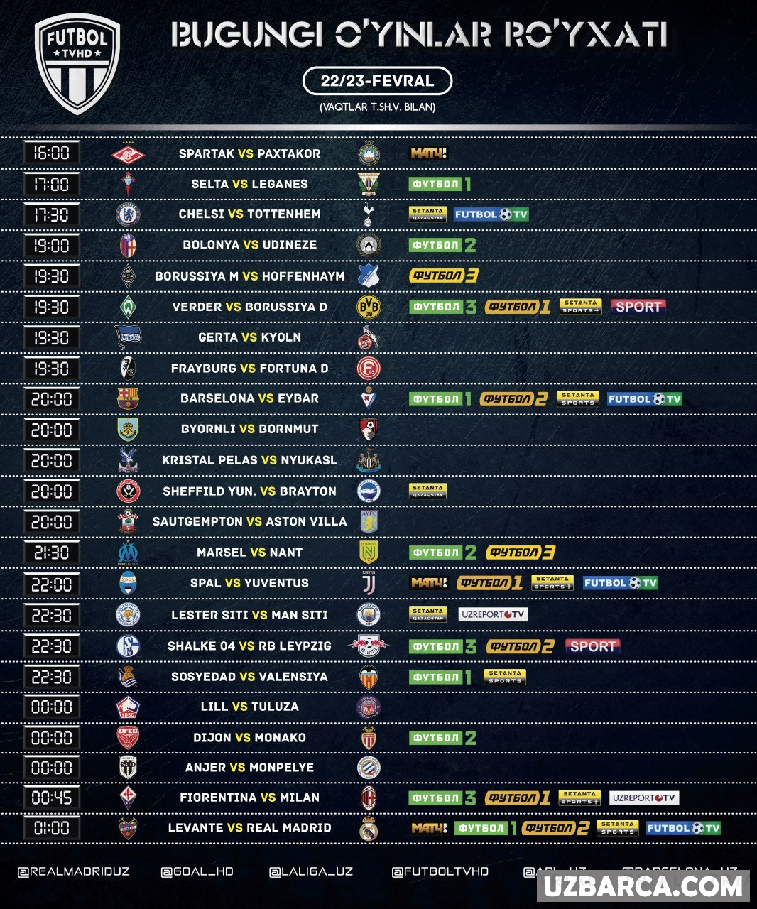 Bugungi uchrashuvlar ro'yxati va ularni translyatsiya qiladigan telekanallar! Barcha o'yinlar Tshv bilan ko'rsatilgan!