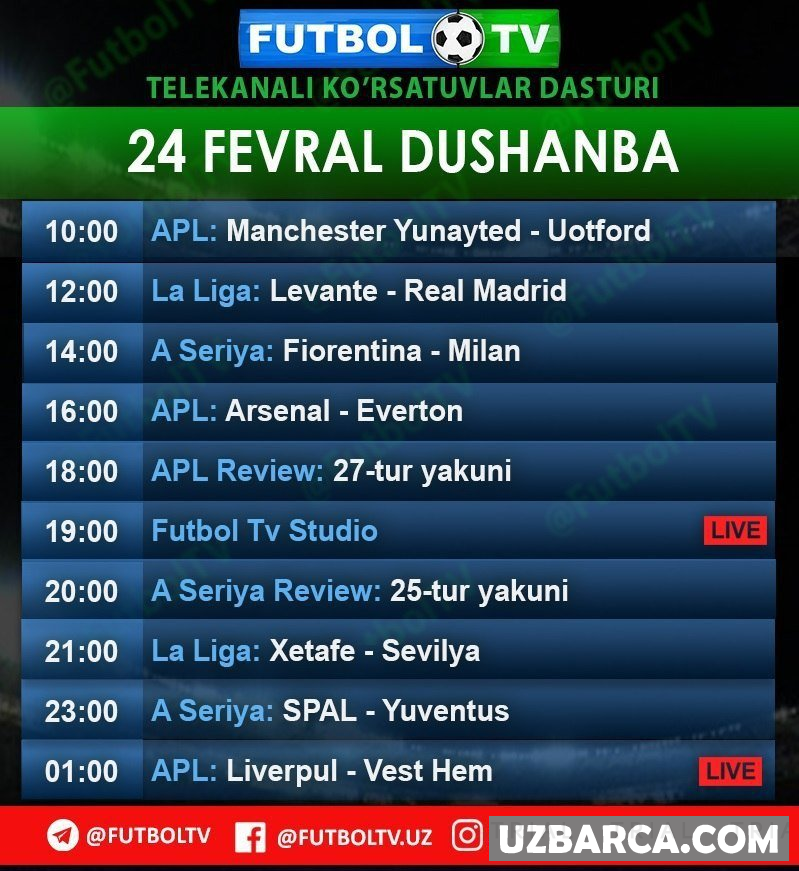 FUTBOL TV telekanalining 24-fevral kunidagi ko'rsatuvlar dasturi