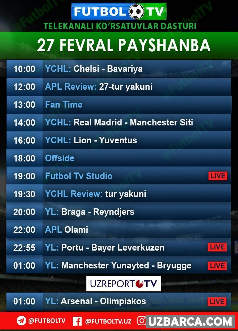 FUTBOL TV telekanalining 27-fevral kunidagi ko'rsatuvlar dasturi