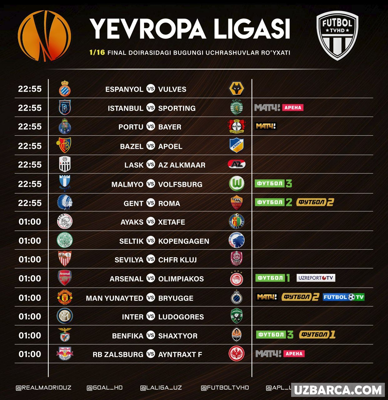 Bugungi uchrashuvlar ro'yxati va ularni translyatsiya qiladigan telekanallar! Barcha o'yinlar Tshv bilan ko'rsatilgan!