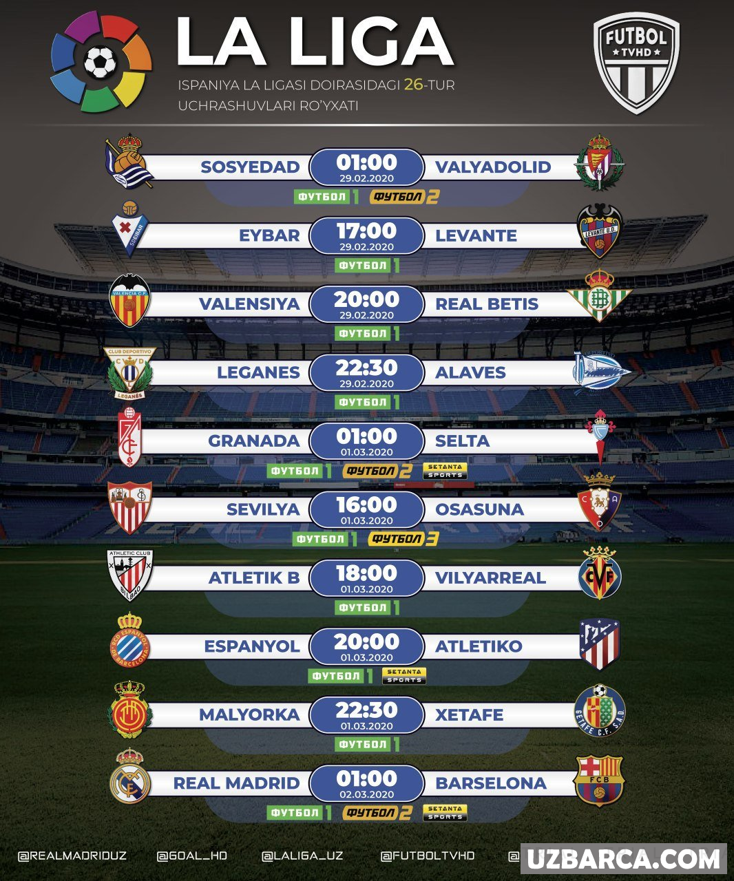 Ispaniya La Ligasining 26-tur uchrashuvlari ro'yxati bilan tanishing! Barcha o'yinlar (Tshv) bilan ko'rsatilgan!