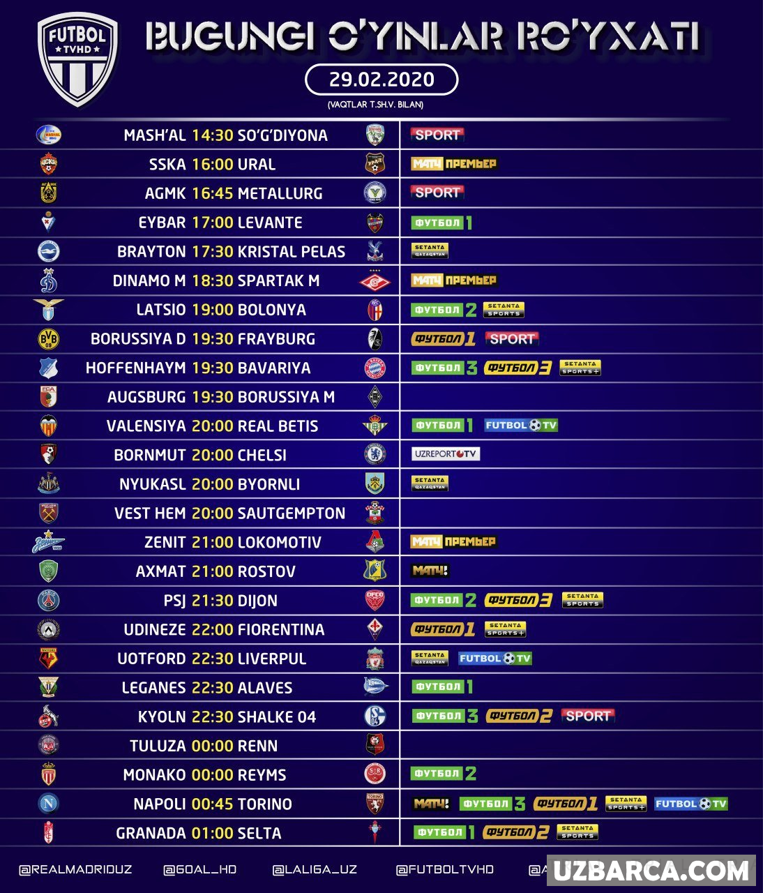 Bugungi uchrashuvlar ro'yxati va ularni translyatsiya qiladigan telekanallar! Barcha o'yinlar Tshv bilan ko'rsatilgan!