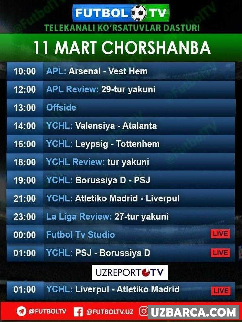 Futbol TV telekanali bugun — 11 mart, chorshanba kuni yuqoriidagi ko'rsatuv va translyatsiyalarni efirga uzatishni rejalashtirgan.