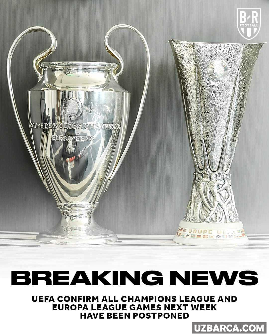 BREAKING: UEFA kelasi hafta Chempionlar ligasi va Evropa Ligasidagi barcha o'yinlarni to'xtatdi.