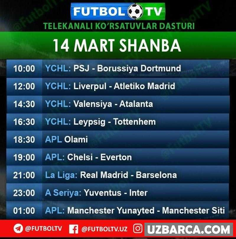 Futbol TV telekanali bugun — 14 mart, shanba kuni quyidagi ko'rsatuv va translyatsiyalarni efirga uzatishni rejalashtirgan.