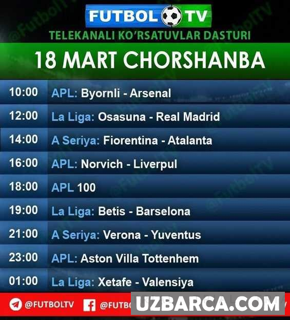 FutbolTV telekanalining 18-mart kungi ko'rsatuvlar dasturi