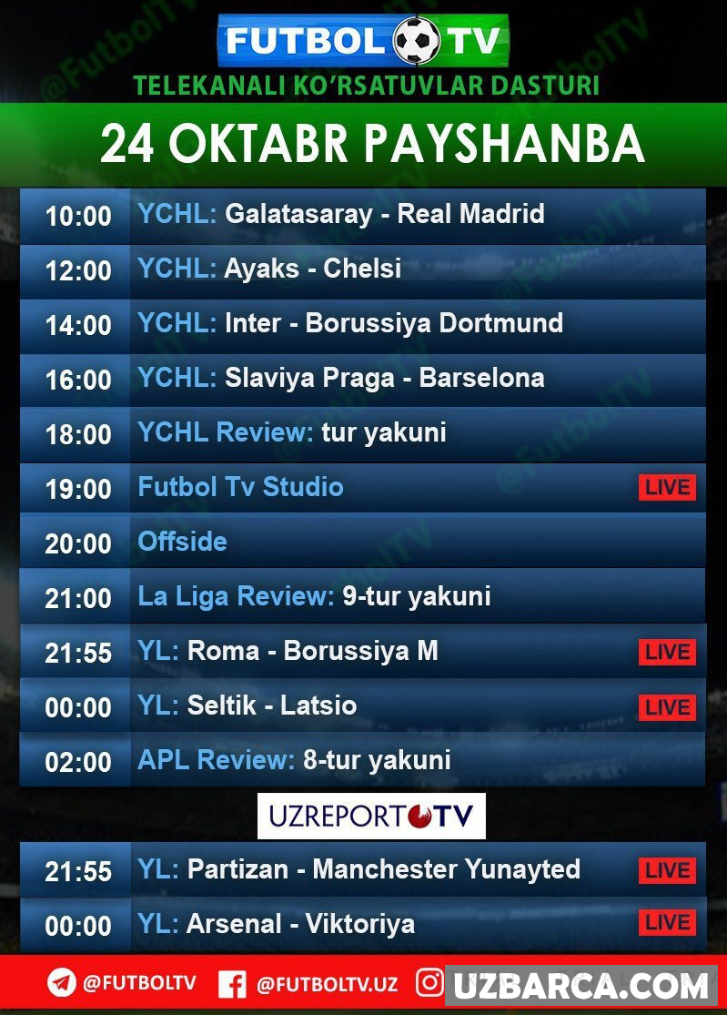 FUTBOL TV telekanalining 24-oktabr kunidagi ko'rsatuvlar dasturi!